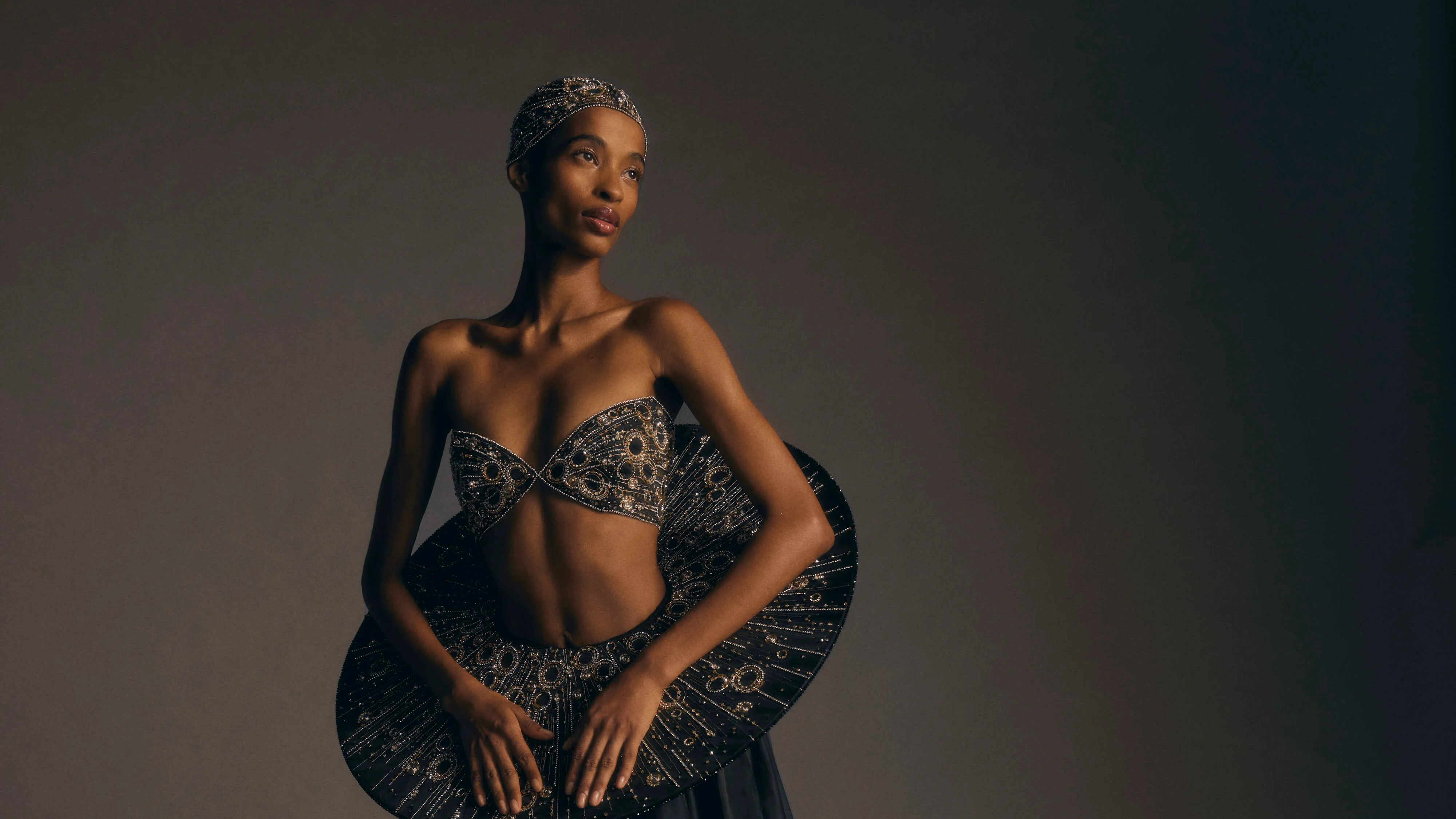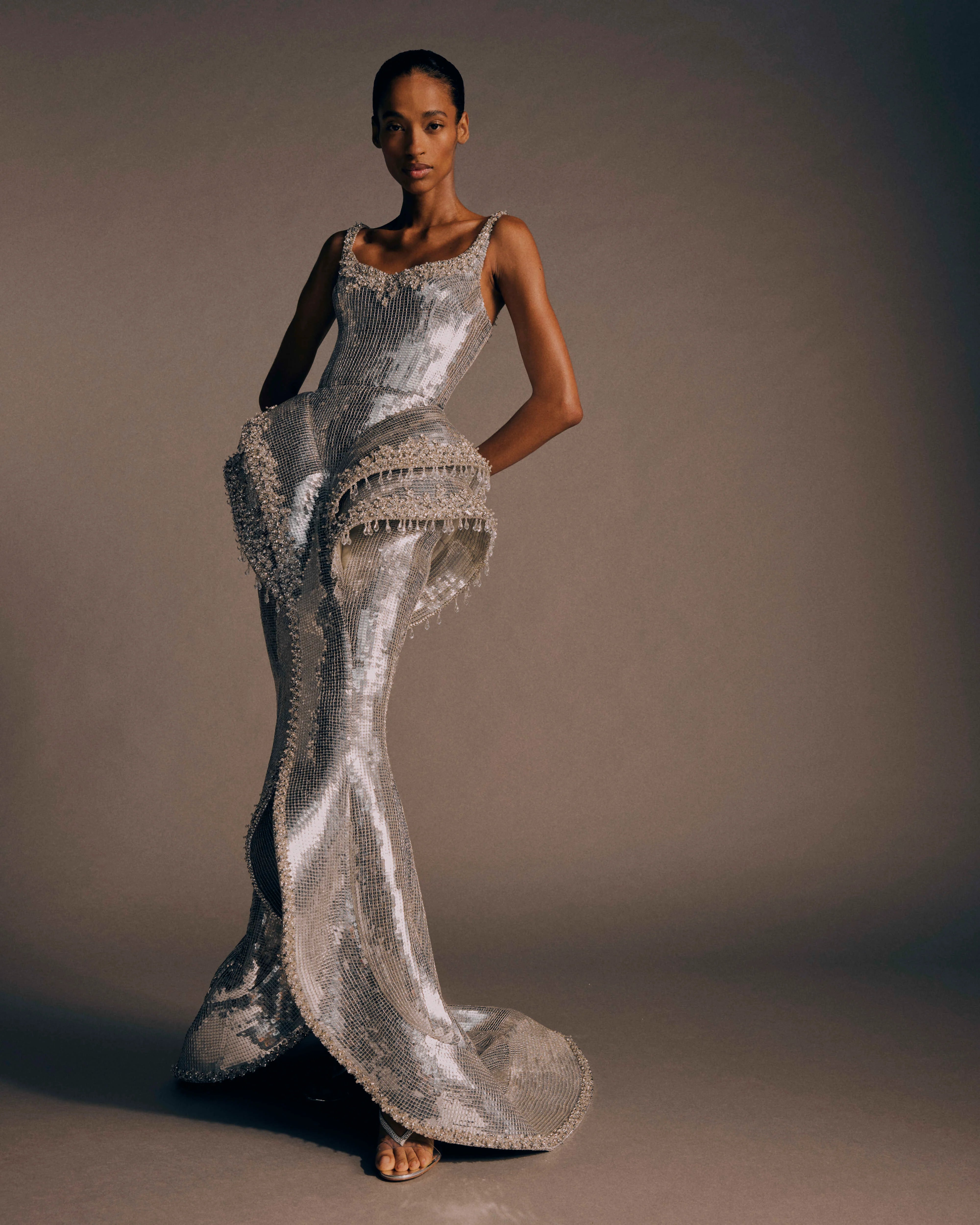 The palette is pulled from a swirling nebula where shades of silver, crimson, gold and deepest black form an intergalactic backdrop. Embroideries are like stardust – tonal sequins, plastic paillettes and clusters of crystals glimmer on otherworldly silhouettes. While satins and velvets in a handful of weights and lustres add a sense of the ethereal.