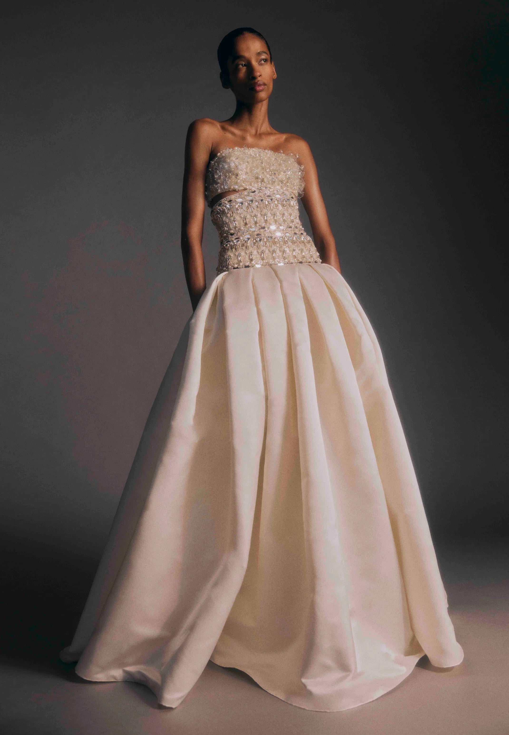 In the grand tradition of couture, the collection closes with a wedding dress. Off-shoulder and handled in cloud-like silk gazar, it’s hand-painted with constellations for a truly interstellar finishing touch.